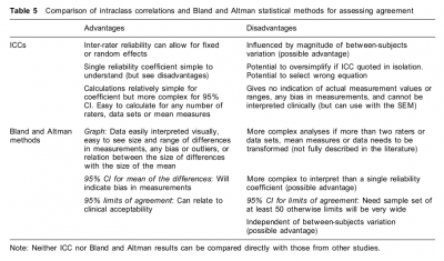“Conclusions: The ICC and Bland and Altman tests are appropriate for analysis of reliability studies of similar design to that described, but neither test alone provides sufficient information and it is recommended that both are used.”